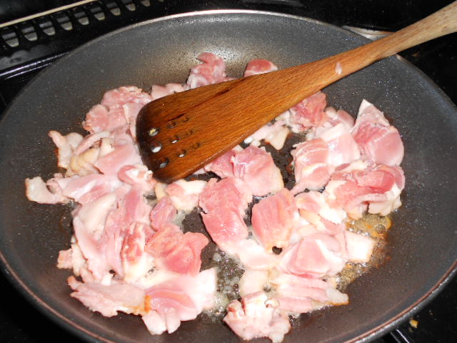 Heat some of the olive oil and fry the bacon till it is well cooked