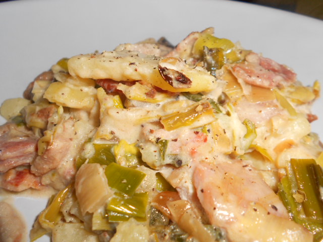 When the leeks are cooked add them to the bacon and then drain the potatoes before adding them.  Cover the mixture with cream and stir well.