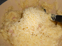 Then mix the bacon into the mashed potato. Add half the grated cheese.