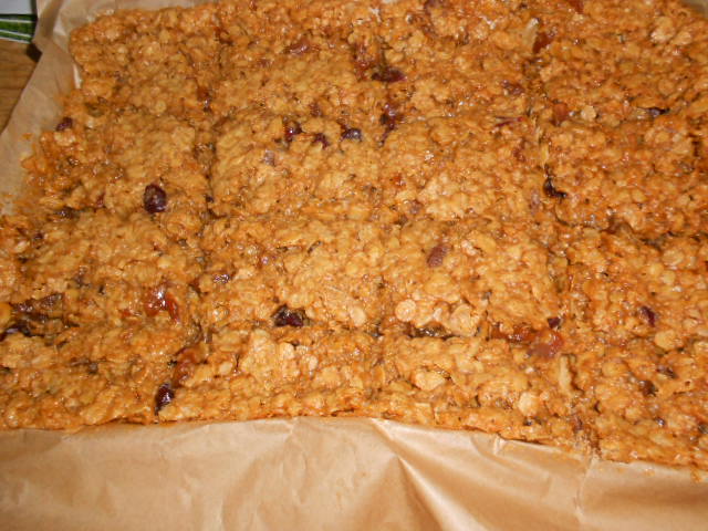When the flapjack turns a golden brown but is still soft to the touch (beware sugar content is really hot) take it from the oven and allow to cool. It will harden once cooled. Score the portion sizes out and once cooled leave in the fridge before cutting it up.