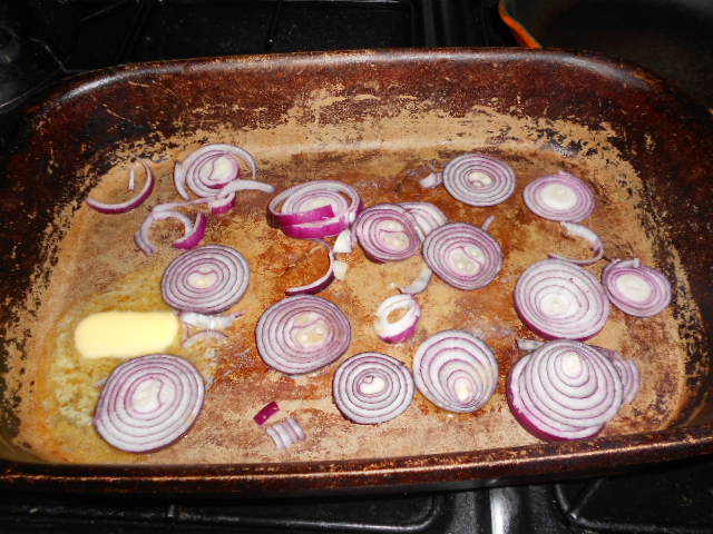 Melt the butter and add the onions cooking in a high heat, for about 5 minutes. Watch them, stir if necessary.