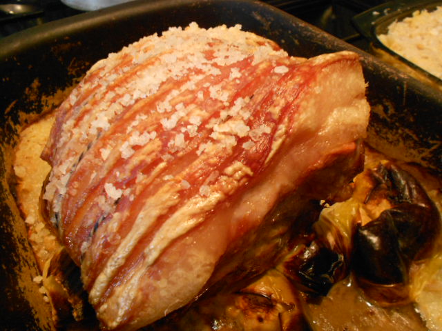 Put it in the oven for about 40 minutes (depending on the size) on high 240C/ gas 9. The skin should turn into wonderfully crisp crackling. Keep the dish topped with water to stop the joint drying out and the apples and onions from burning.