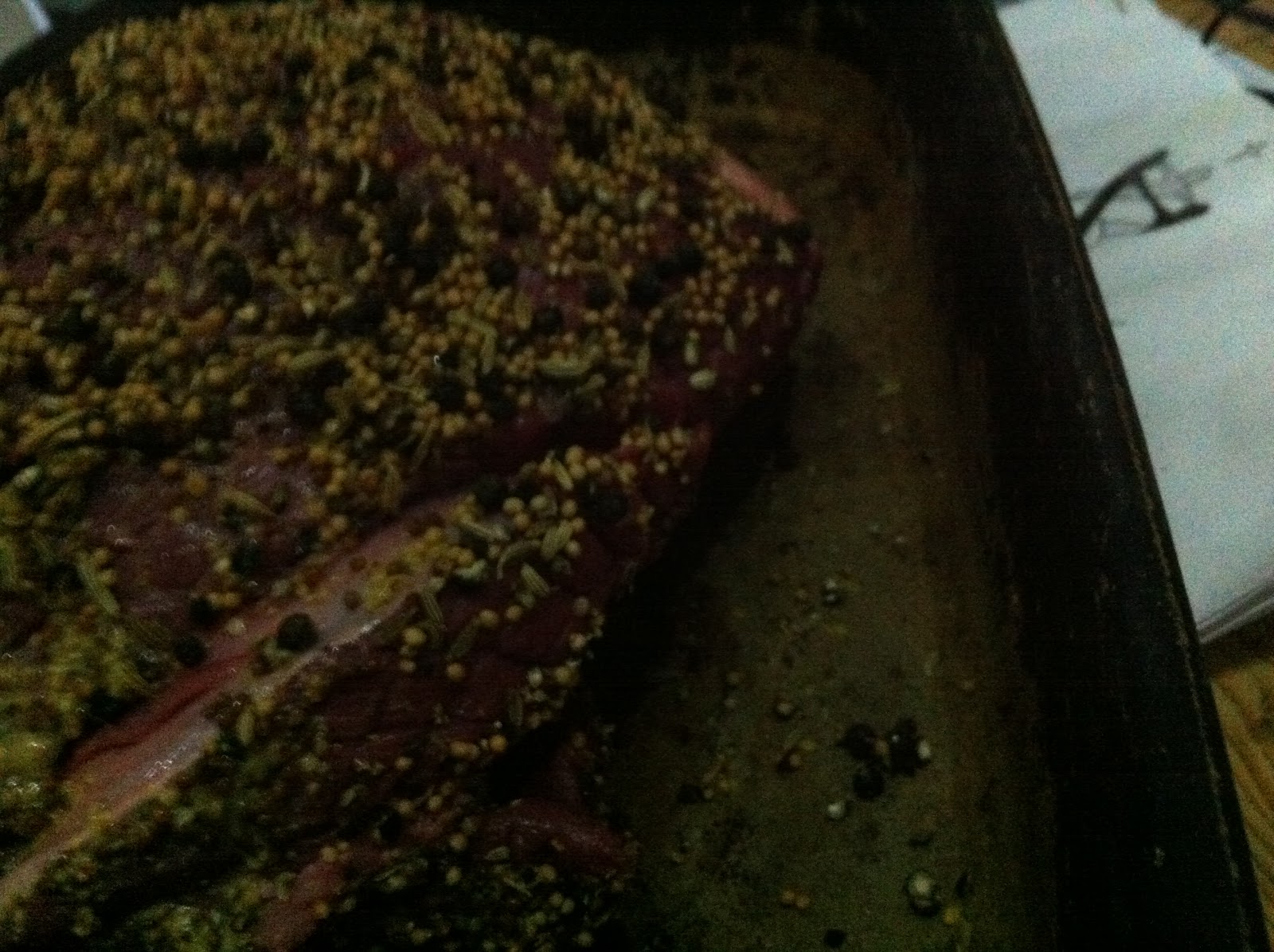 Spread the peppercorn mix over a plate or roasting dish and roll the oiled joint in the mix.
