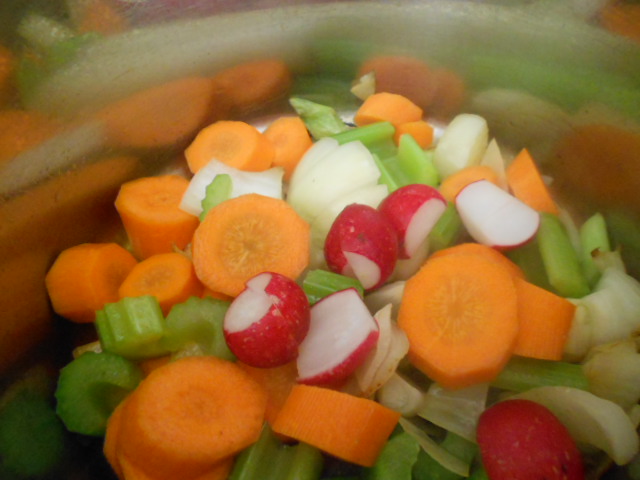 Vegetables chopped to smallish sizes – celery, leek, carrot, pieces of squash, courgettes, whatever you have in the fridge. Not too much of anyone thing