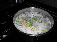 Boil the water and add the pasta, halfway through cooking add the peas.