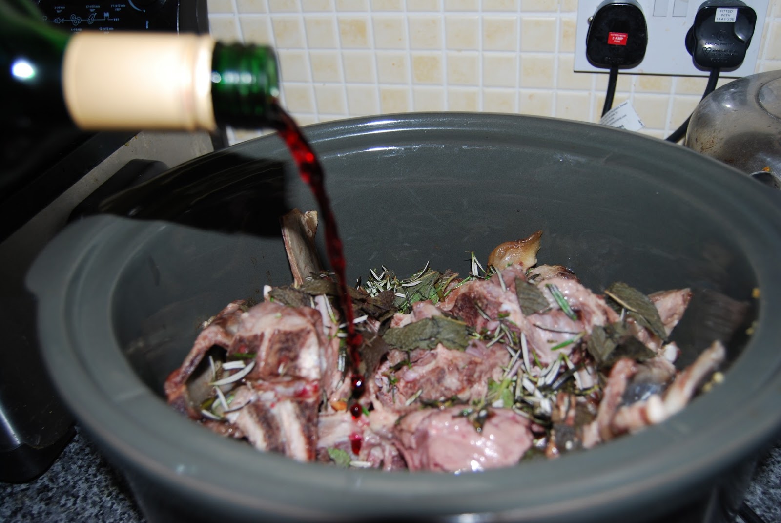 Add a generous glug of red wine over the top then add enough stock to cover everything in the pan including the potatoes which you can add now or wait and add nearer serving time.